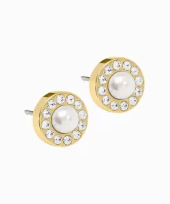 Developed in consultation with skin specialists, the Brilliance Halo Pearl is set in our pure medical grade titanium. Pure medical grade titanium is the safest metal for those with sensitive skin. This skin friendly earring features a center White Pearl surrounded by sparkling Crystals. The gold colored coating is only applied to the parts of the jewelry that don’t come into direct contact with your skin.